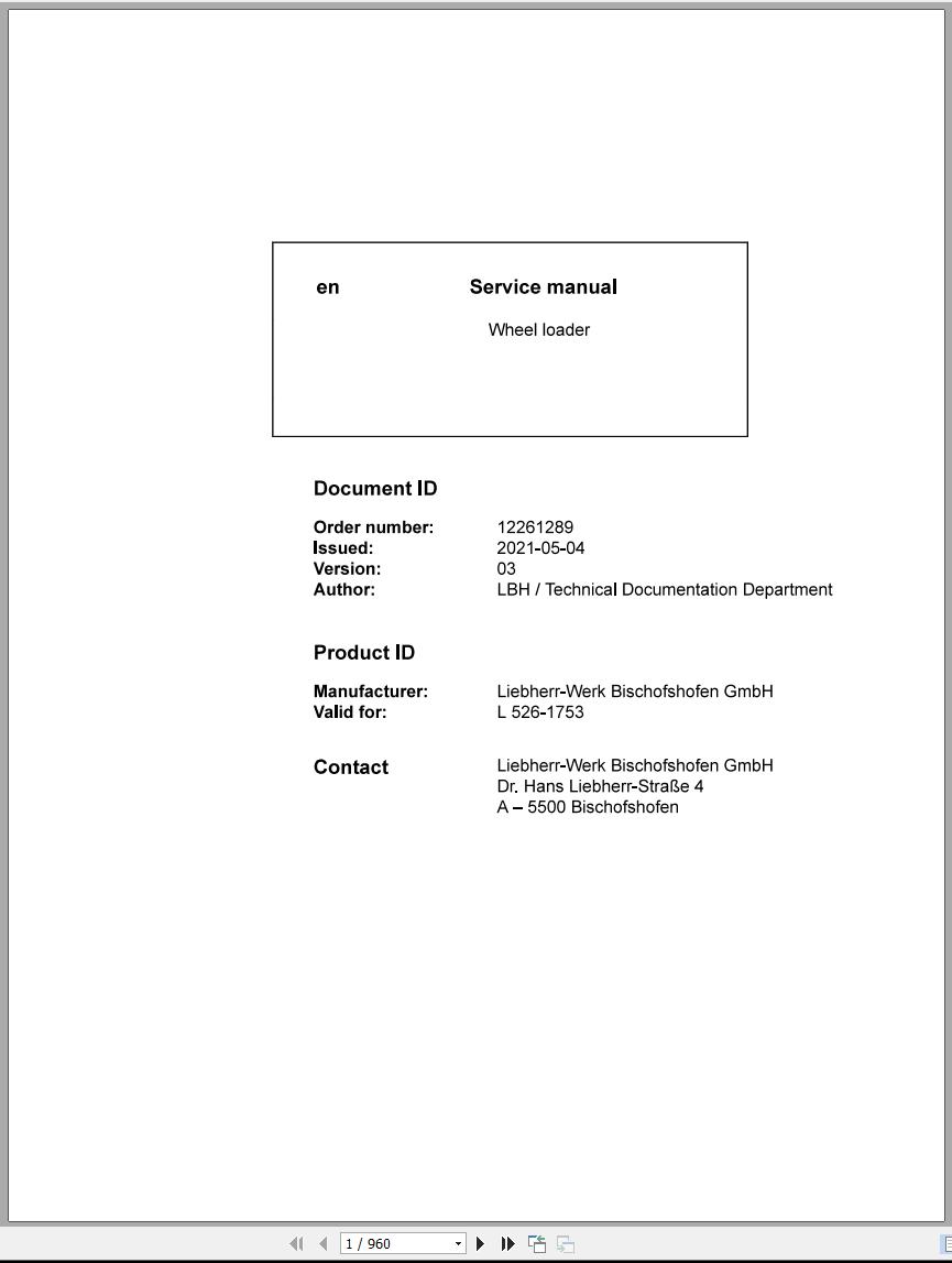 Liebherr L526-1753 Service Manual 12261289 2021