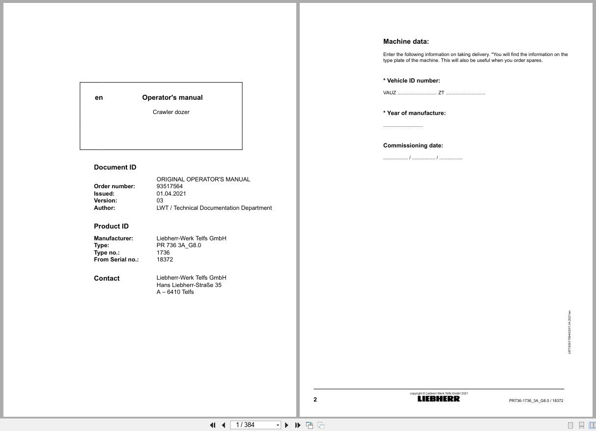Liebherr PR736 1736 Operators Manual 93517564 2021