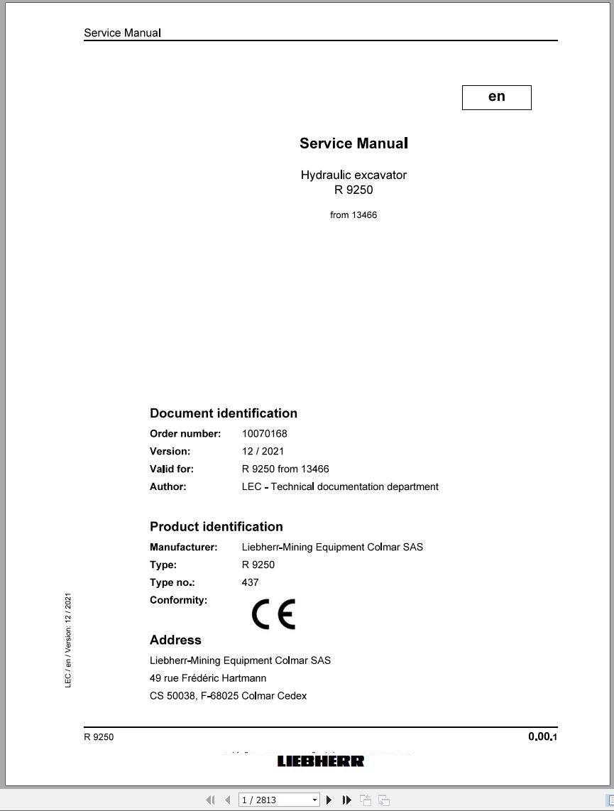 Liebherr R9250 Service Manual 10070168 12.2021