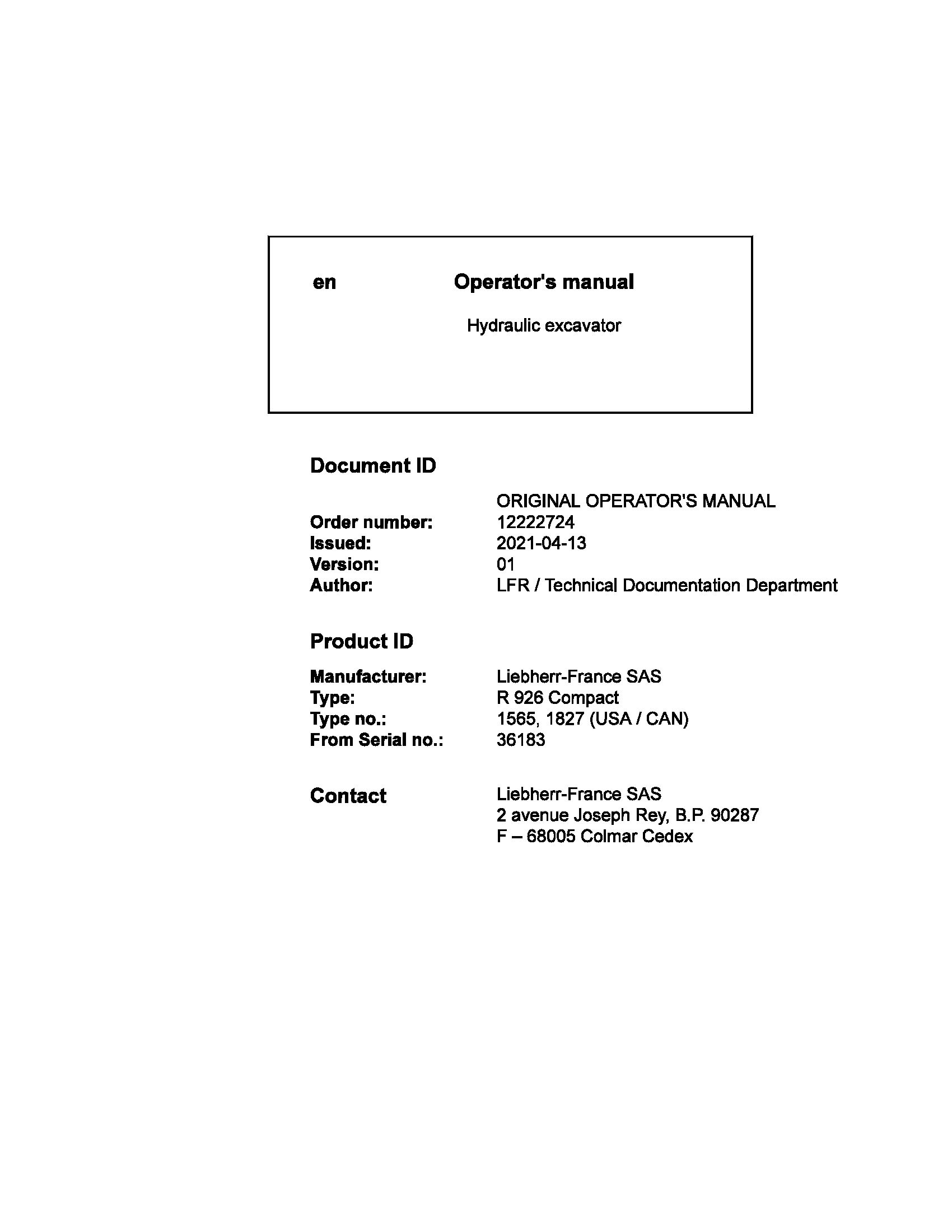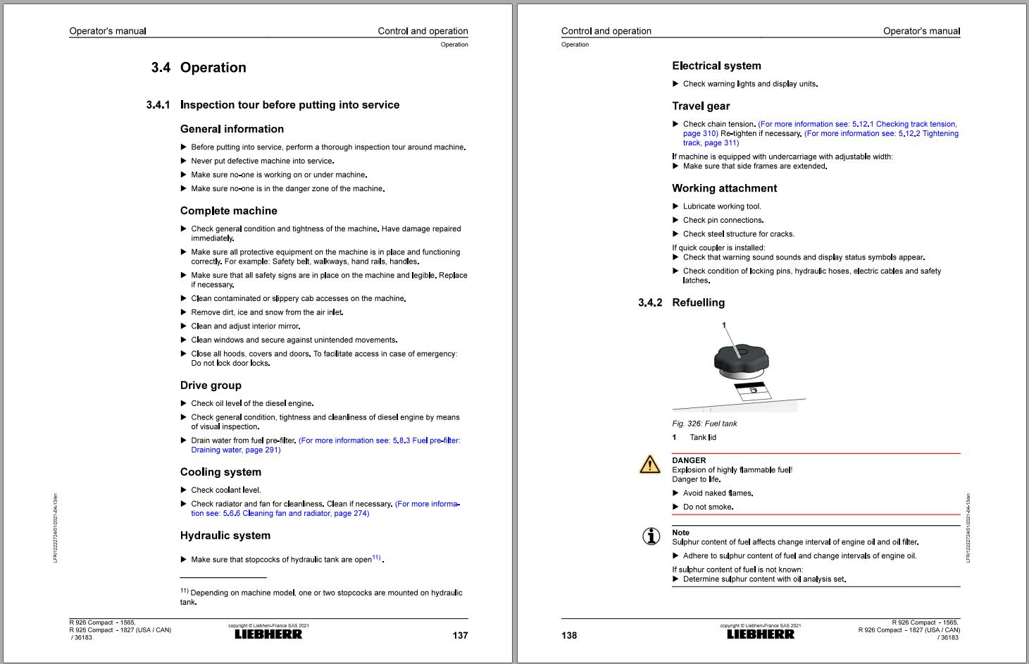 Liebherr R926 Compact Original Operators Manual 12222724 2021