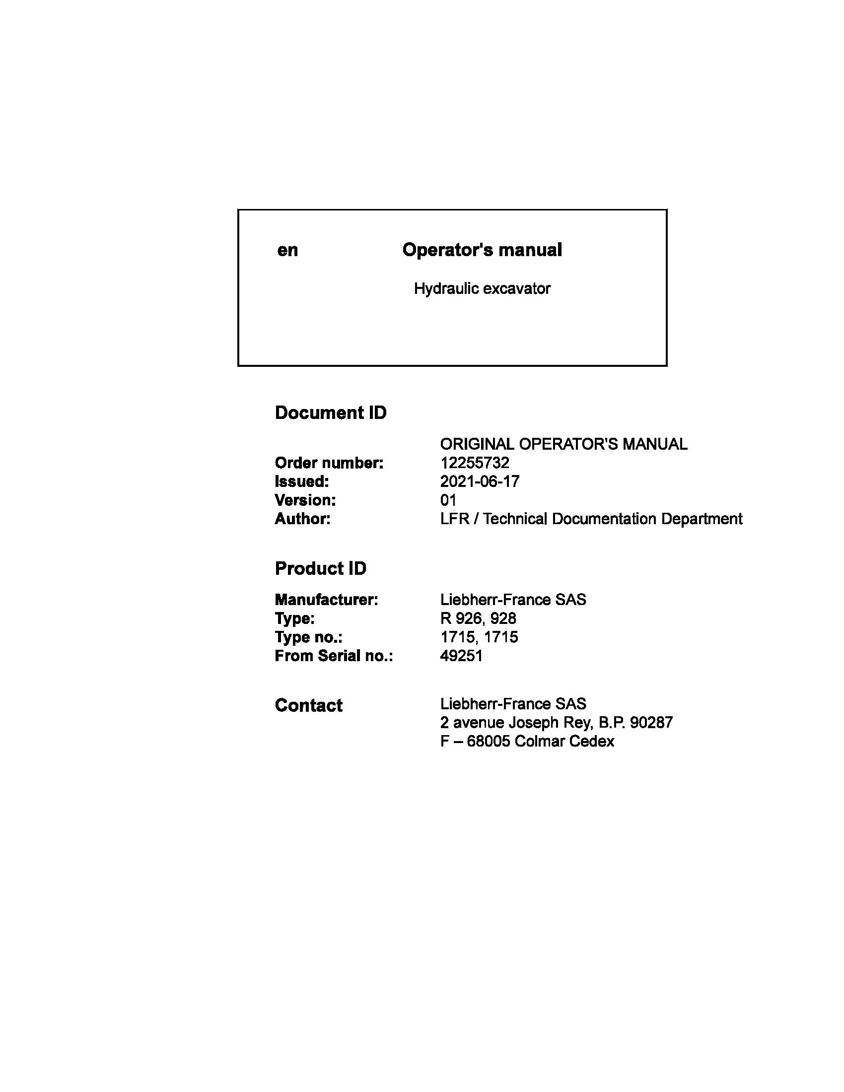 Liebherr R926 R928 Original Operators Manual 12255732 2021