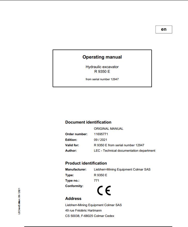 The Bookmarks of Liebherr R9350E Original Operators Manual:
