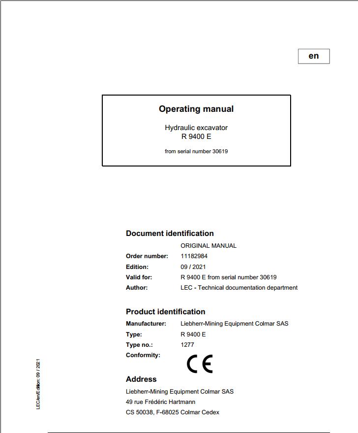 The Bookmarks of Liebherr R9400E Original Operators Manual:
