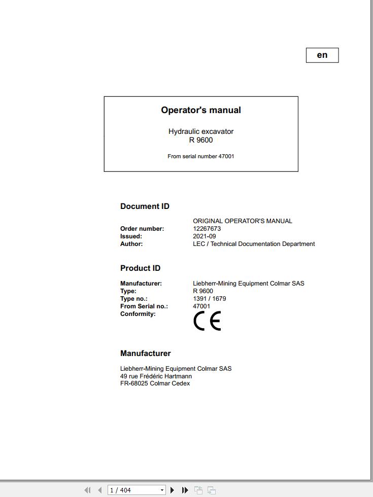 Liebherr R9600 Original Operators Manual 2021