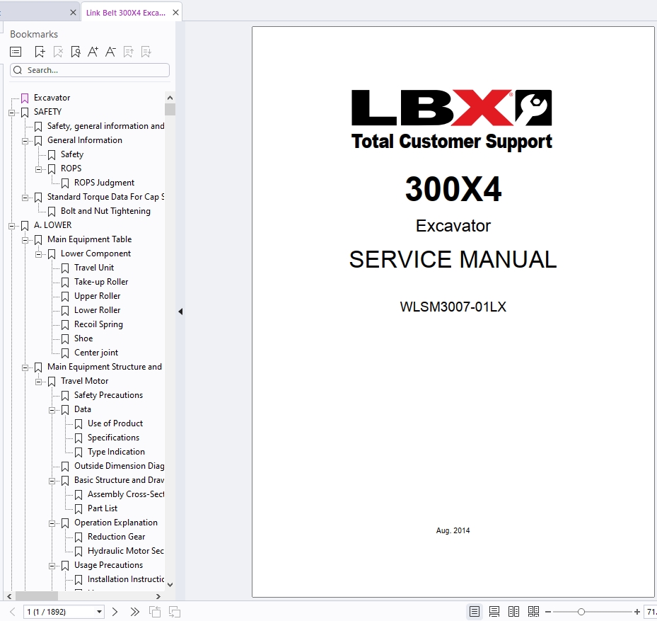 The Bookmarks of Link Belt 300X4 Excavator Service Manual WLSM3007-01LX Aug. 2014 :