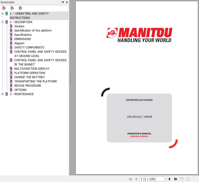 The Bookmarks of Manitou 100 VJR AUS 100 VJR Mobile Elevating Work Platform Operator's Manual: