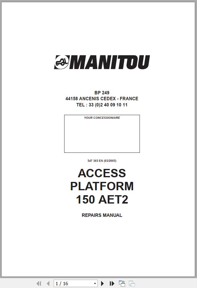 Manitou 150 AET2 General Points Repair Manual 547365 16 Pages