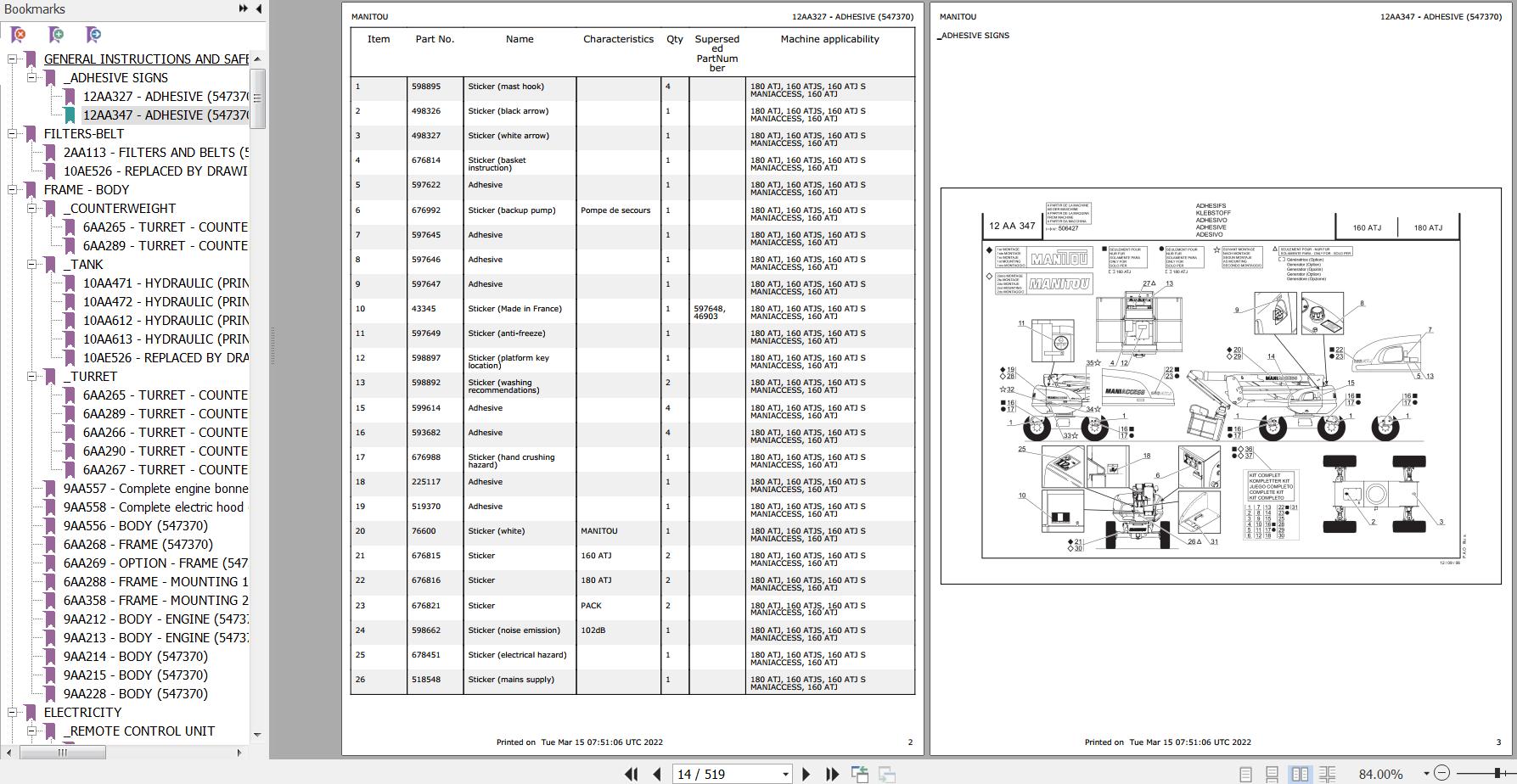 The Bookmarks Of Manitou 160 ATJ S MANIACCESS Mobile Elevating Platform Parts Catalog: