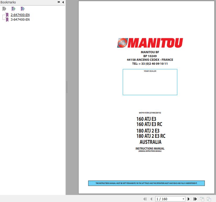 Manitou 160ATJE3 160ATJE3RC 180ATJ2E3 180ATJ2E3RC Instruction's Manual 647414
