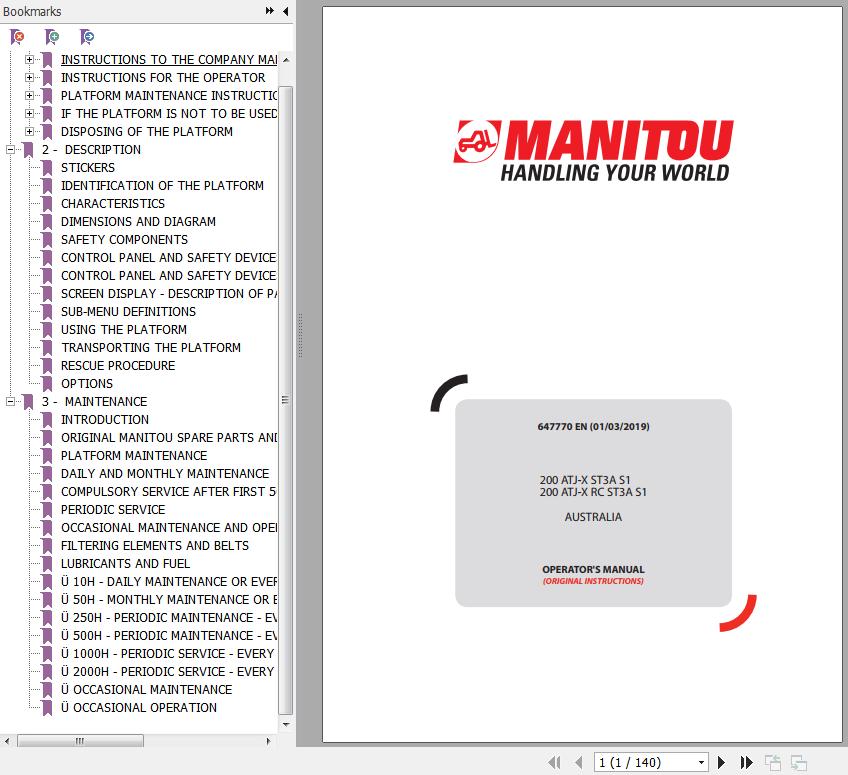 The Bookmarks of Manitou 200 ATJ-X ST3A S1 200 ATJ-X RC ST3A S1 Mobile Elevating Work Platform Operator's Manual: