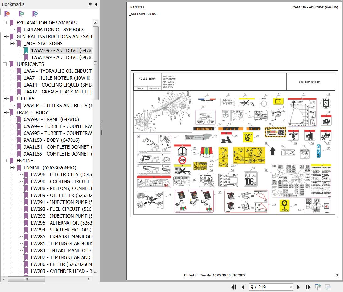The Bookmarks Of Manitou 260 TJP ST5 S1 Mobile Elevating Platform Parts Catalog: