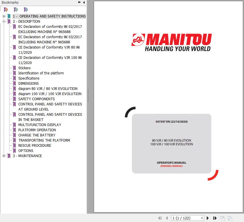 The Bookmarks of Manitou 80 VJR 100 VJR 80 VJR EVOLUTION 100 VJR EVOLUTION Operator's Manual: