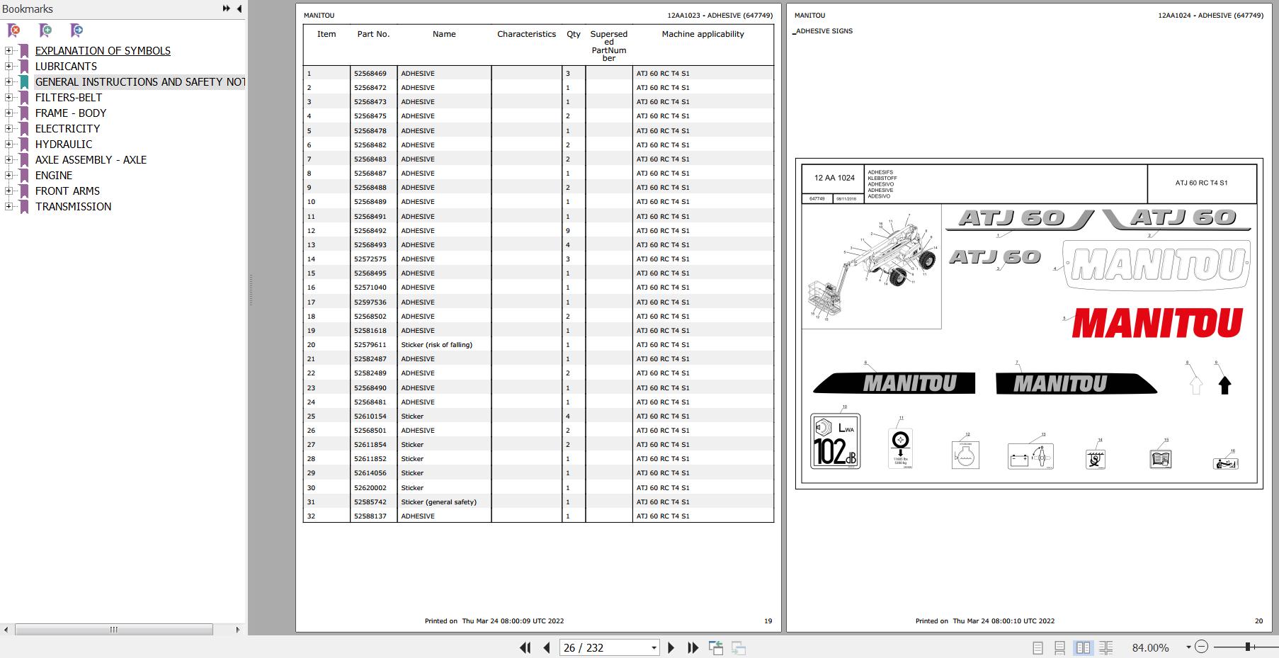 The Bookmarks Of Manitou ATJ 60 RC T4 S1 Mobile Elevating Platform Parts Catalog: