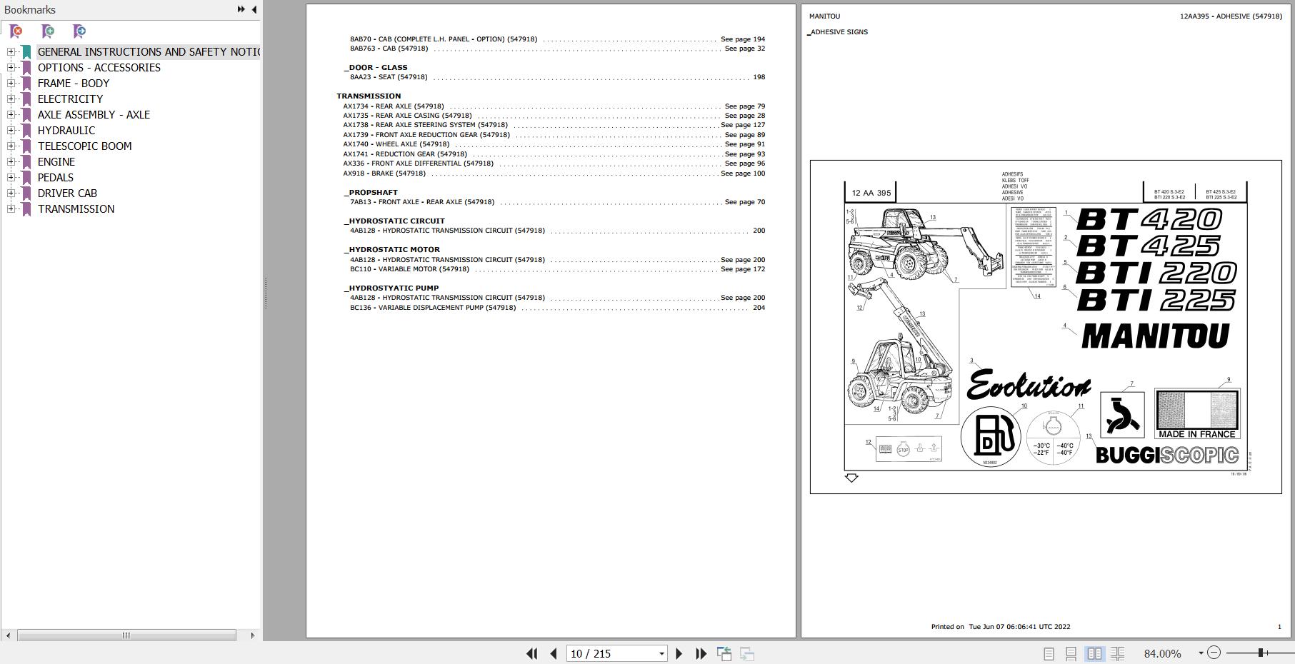 The Bookmarks Of Manitou BT 420 425 BTI 220 225 S3-E2 Telescopic Handler Parts Catalog: