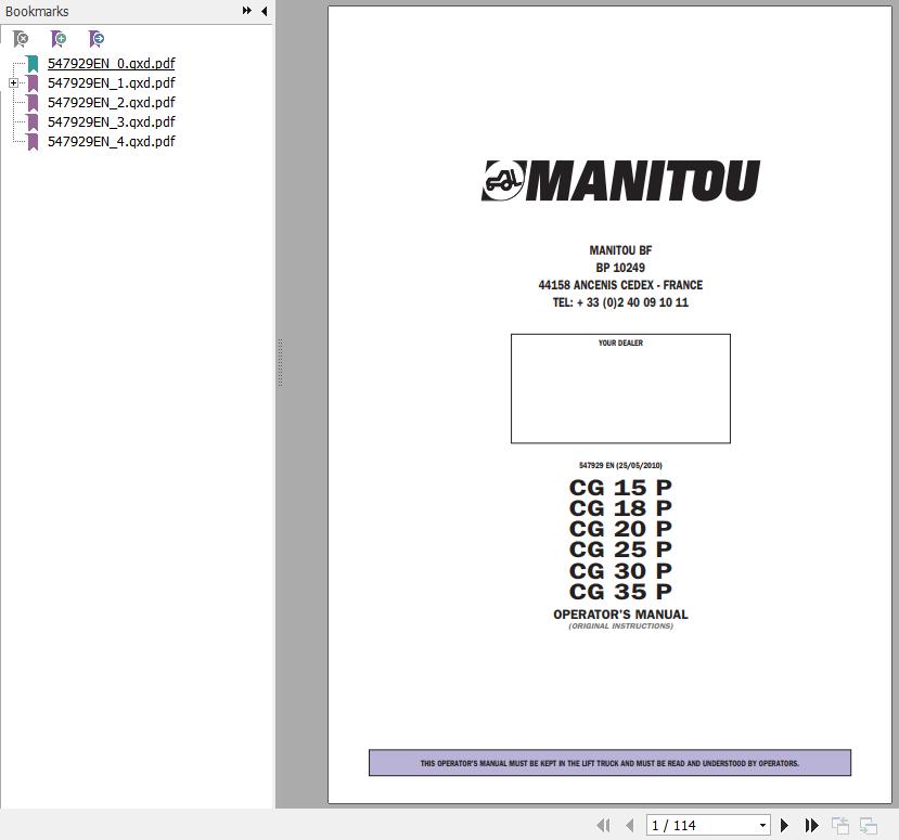 The Bookmarks of Manitou CG 15 P CG 18 P CG 20 P CG 25 P CG 30 P CG 35 P Forklift Operator's Manual: