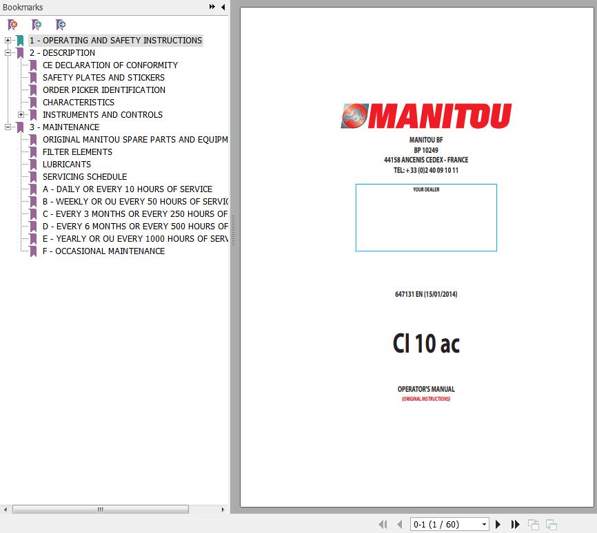 The Bookmarks of Manitou CI 10 ac Forklift Operator's Manual:
