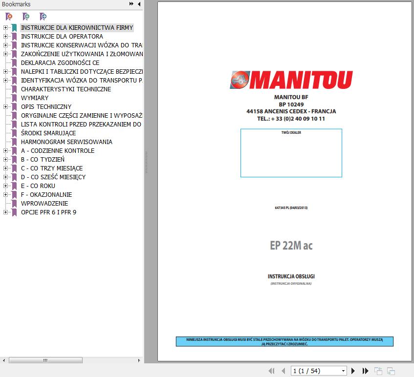 The Bookmarks of Manitou EP22Mac Forklift Operator's Manual: