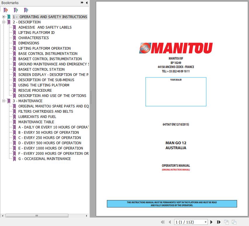 The Bookmarks of Manitou MAN' GO 12 Mobile Elevating Work Platform Operator's Manual: