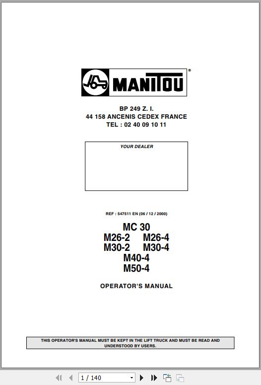 Manitou MC 30 MC 26-2 MC 26-4 MC 30-2 MC 30-4 MC 40-4 MC 50-4 Operator's Manual 547511