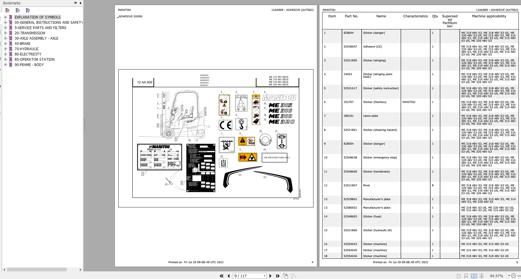 The Bookmarks of Manitou ME 320 48V S3 US Forklift Parts Manual: