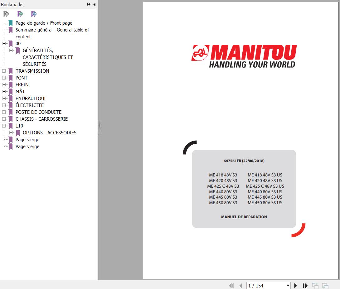 The Bookmarks Of Manitou ME 418 420 425C 440 445 450 48V S3 Forklift Repair Manual: