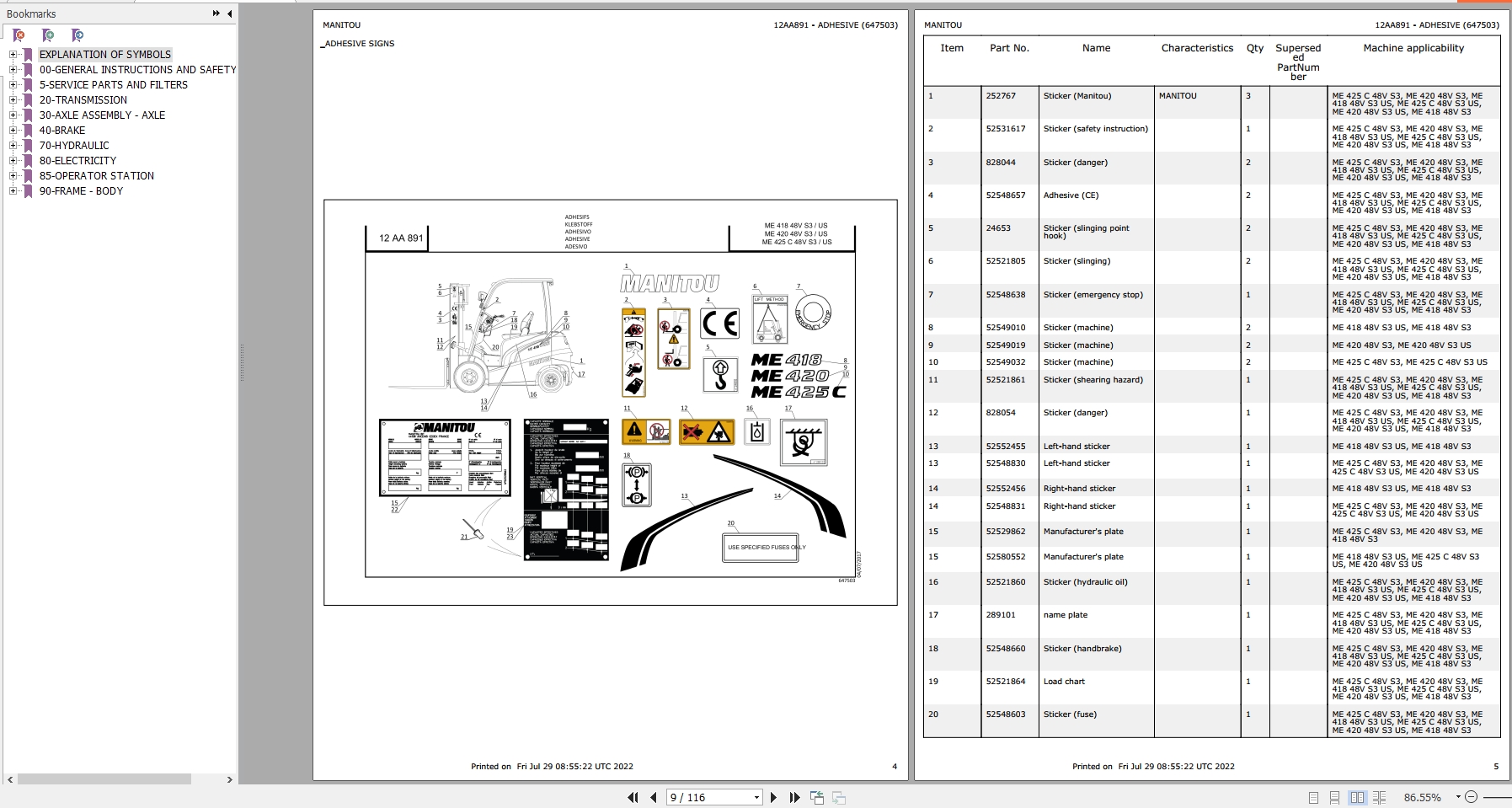 The Bookmarks of Manitou ME 420 48V S3 Forklift Parts Manual: