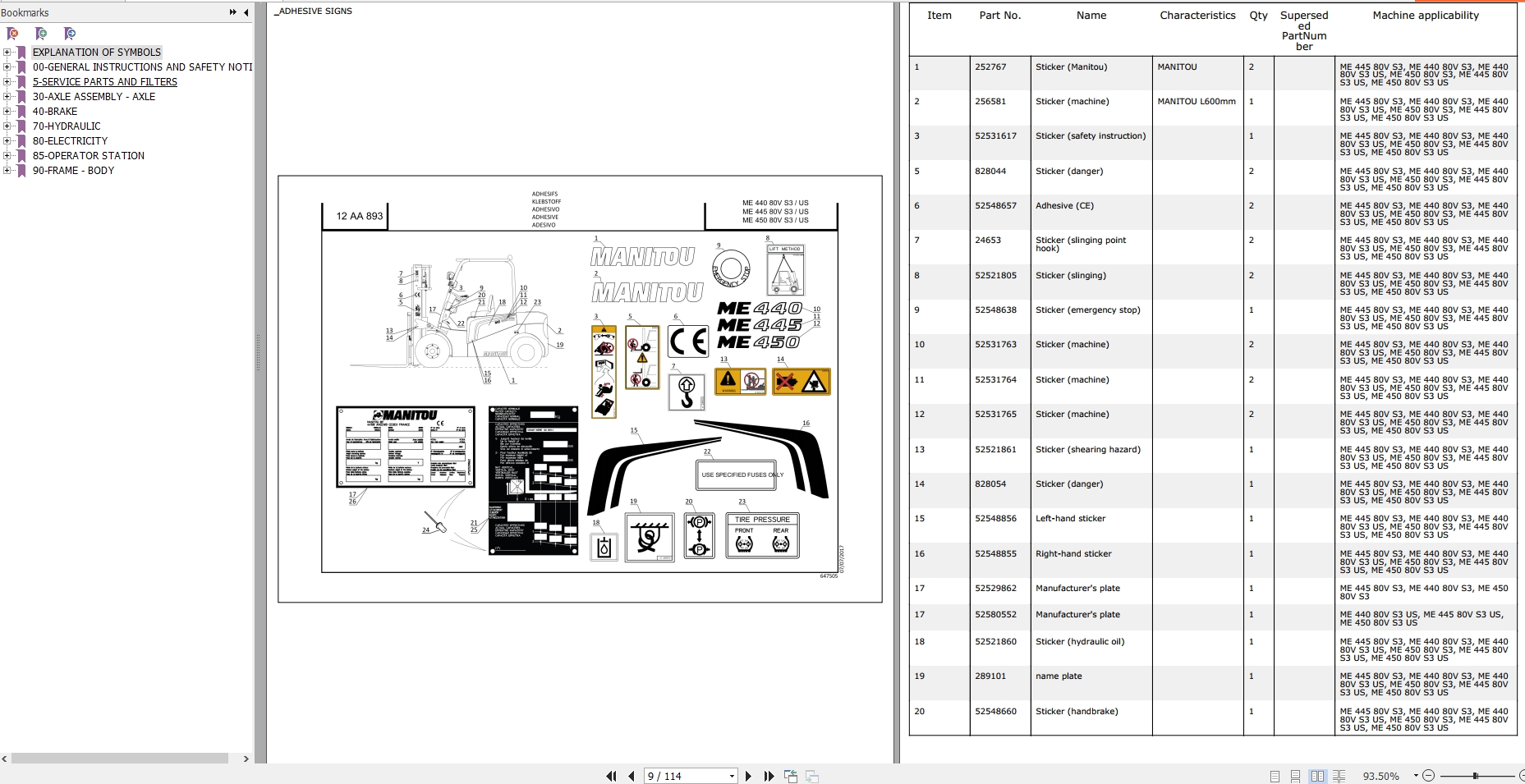The Bookmarks of Manitou ME 445 80V S3 Forklift Parts Manual: