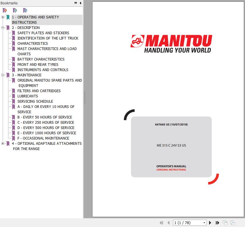 The Bookmarks of Manitou ME 315C 24V S3 US Forklift perator's Manual: