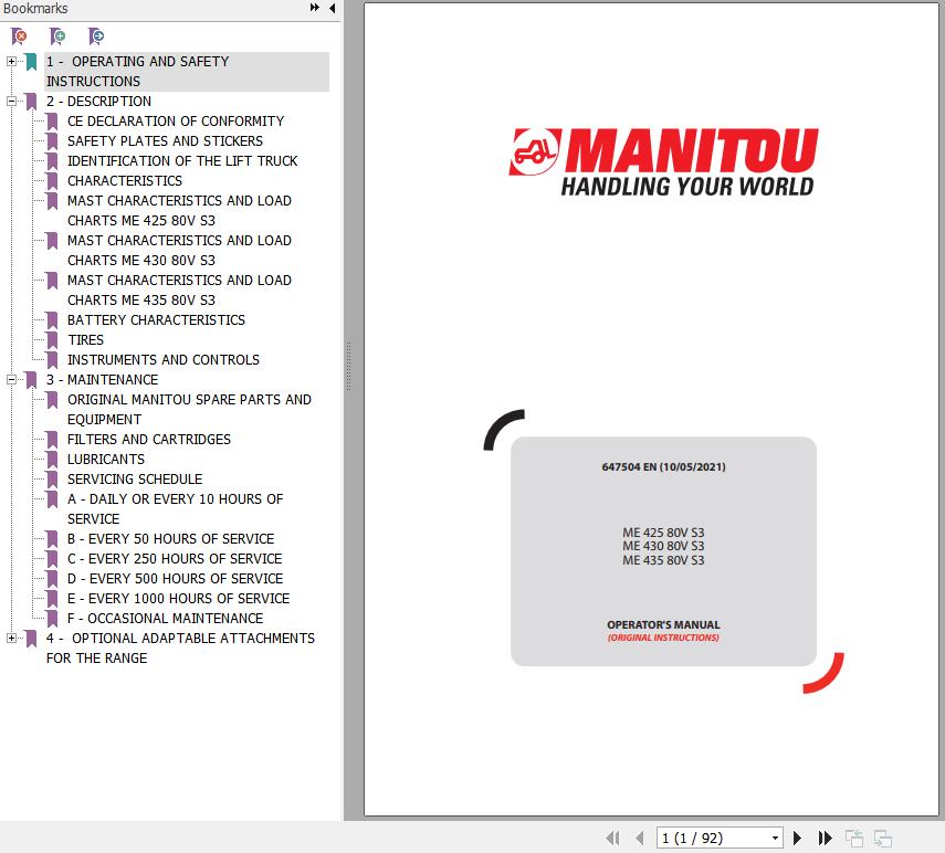 The Bookmarks of Manitou ME 425 80V S3 ME 430 80V S3 ME 435 80V S3 Operator's Manual: