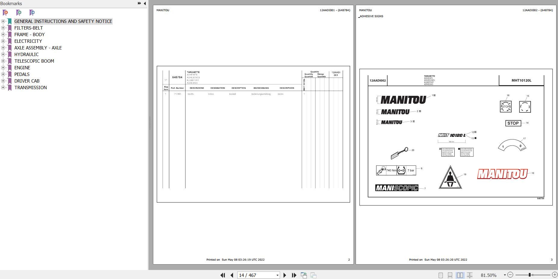 The Bookmarks Of Manitou MHT 10120 L Telescopic Handler Parts Catalog: