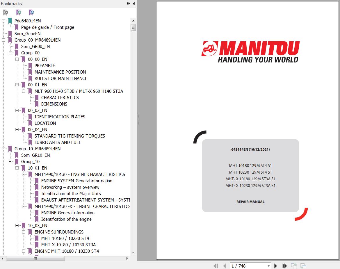 The Bookmarks Of Manitou MHT 10180 10230 129M ST4 S1 MHT-X 10180 10230 129M ST3A S1 Telescopic Handler Repair Manual: