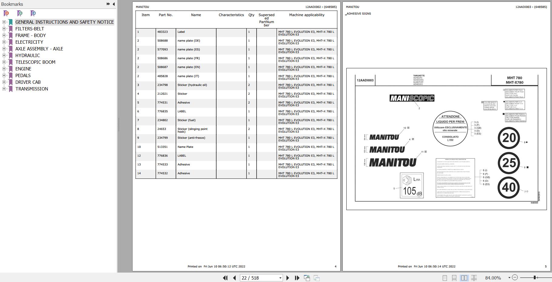 The Bookmarks Of Manitou MHT 780 MHT-X 780 L EVOLUTION E3 Telescopic Handler Parts Catalog: