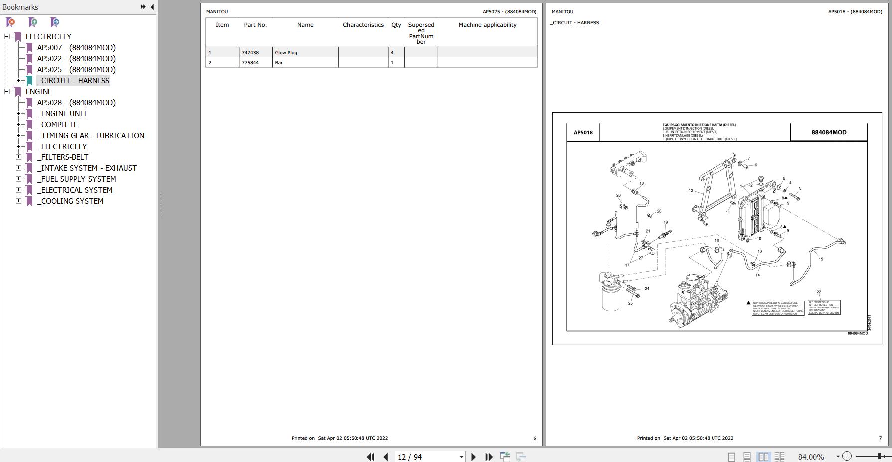 Manitou MHT 780 MINING Parts Catalog 884084MOD
