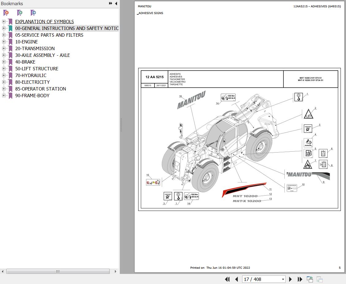 The Bookmarks Of Manitou MHT-X 10200 210Y ST3A S1 Telescopic Handler Parts Catalog: