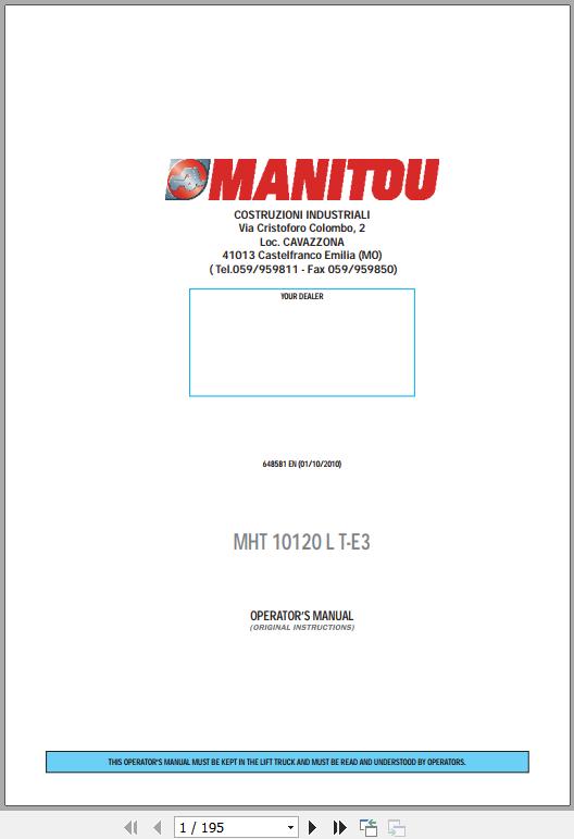 The Bookmarks of Manitou MHT 10120 LT-E3 Telescopic Handlers Operator's Manual:
