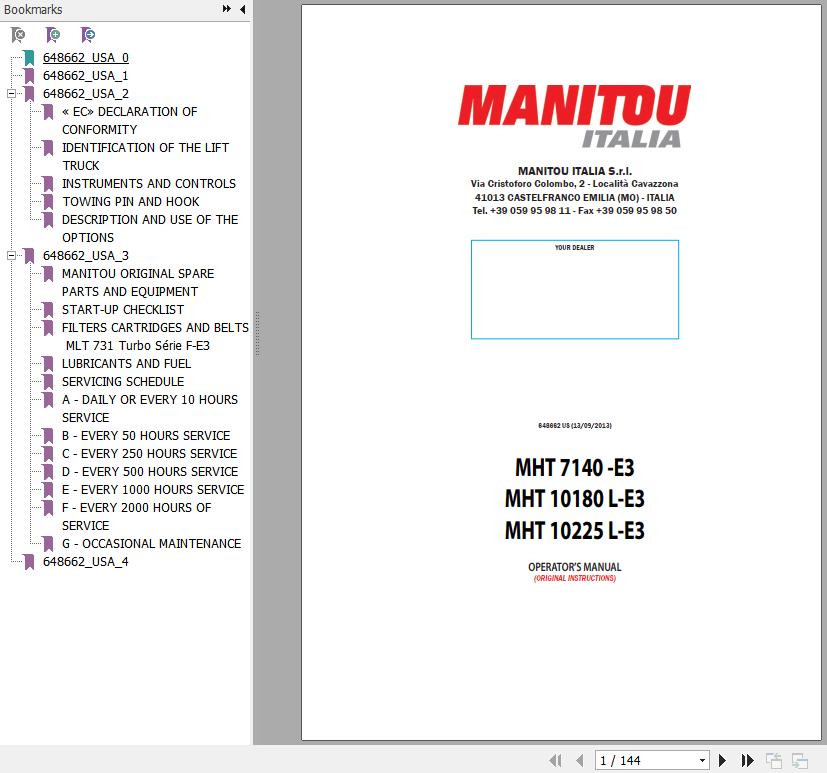 The Bookmarks of Manitou MHT 7140 E3 MHT 10180 L-E3 MHT 10225 L-E3 Telescopic Handlers Operator's Manual: