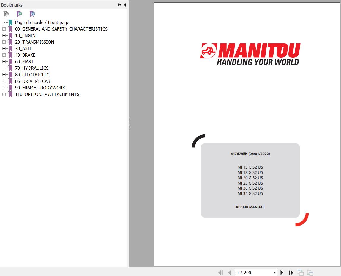 Manitou MI 15 18 20 25 30 35 G S2 US Repair Manual 647679 2022