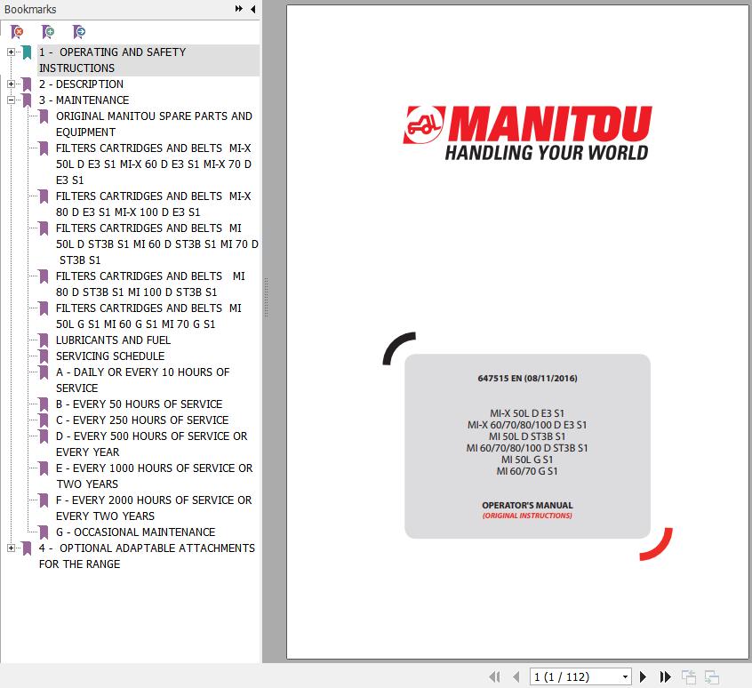 Manitou MI-X 50 L D E3 S1 To MI 70 G S1 Operator's Manual 647515