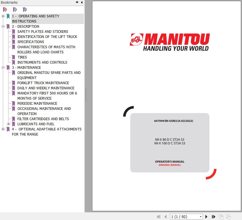 Manitou MI-X 80 D C ST3A S3 MI-X 100 D C ST3A S3 Operator's Manual 647994EN-USM2A022022