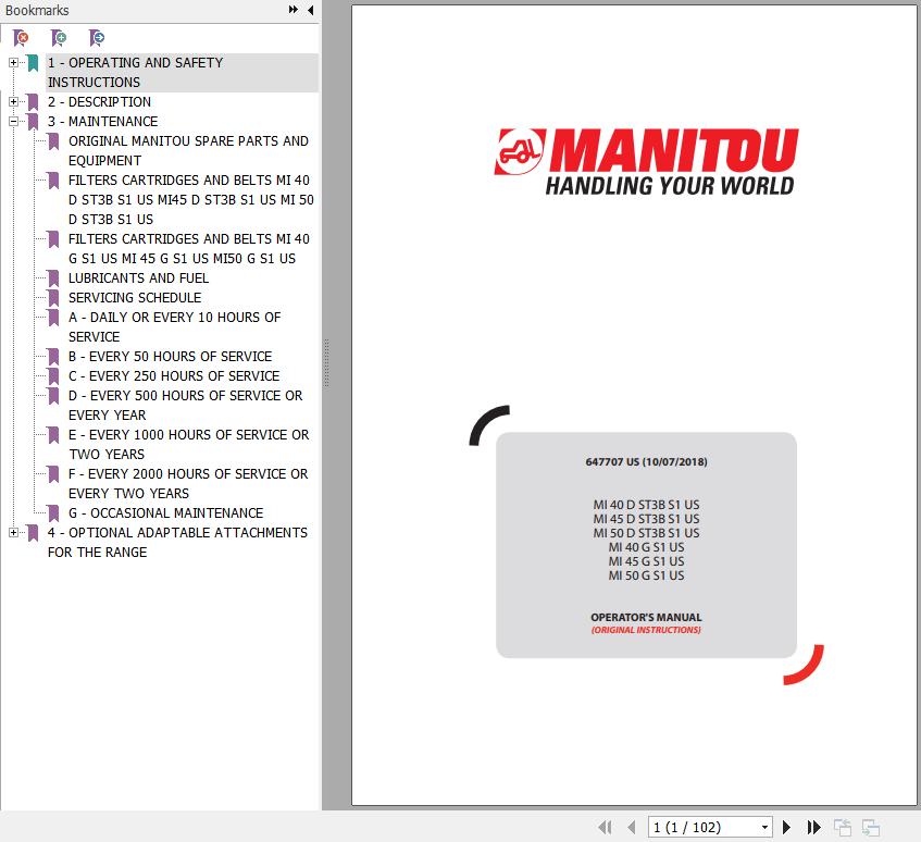 Manitou MI 40 D ST3B S1 US To MI 50 G S1 US Operator's Manual 647707 US