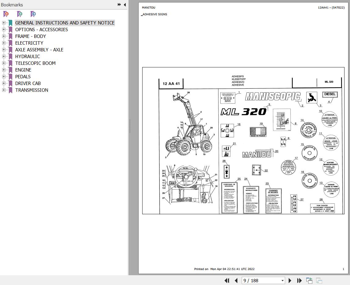 The Bookmarks Of Manitou ML 320 Telescopic Handler Parts Catalog:
