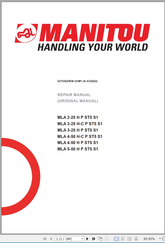 Manitou MLA 2-25 MLA 3-25 MLA 3-25 MLA 4-50 MLA 4-50 MLA 5-50 H P ST5 S1 Repair Manual 52743624EN-USM1