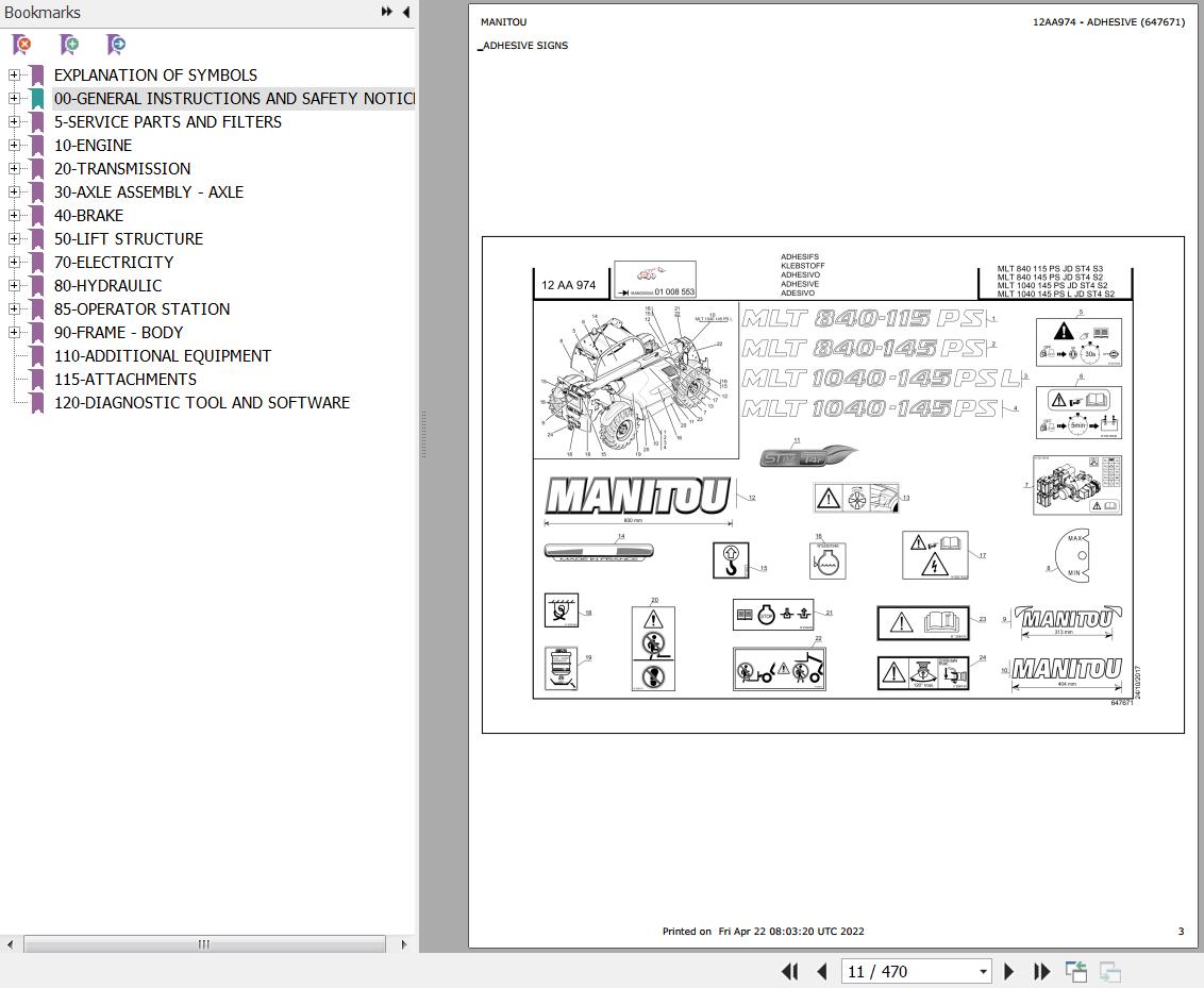 The Bookmarks Of Manitou MLT 1040 145 PS L JD ST4 S2 Telescopic Handler Parts Catalog: