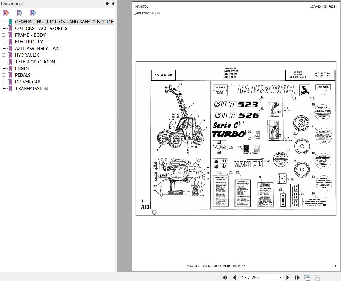 The Bookmarks Of Manitou MLT 523 S2 Telescopic Handler Parts Catalog: