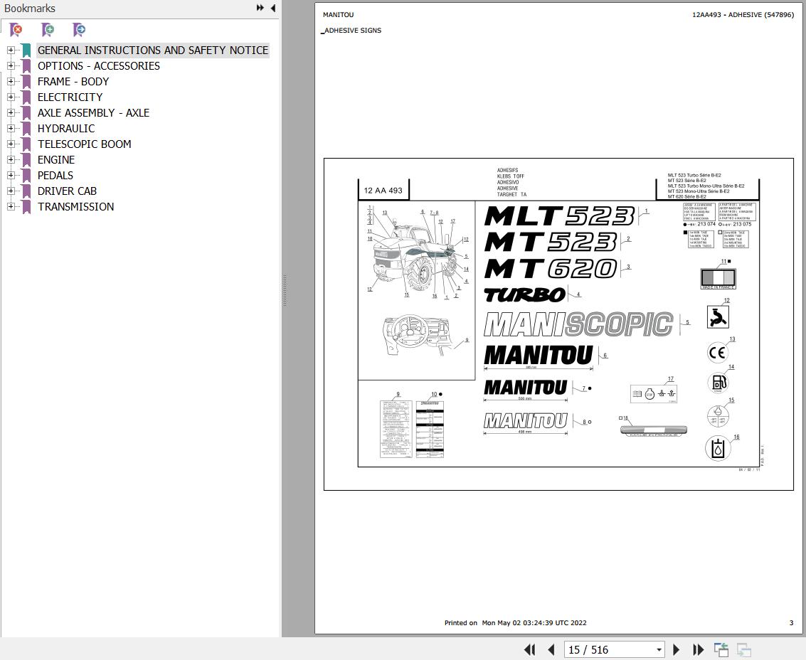 The Bookmarks Of Manitou MLT 523 TURBO MONO ULTRA SB E2 Telescopic Handler Parts Catalog:
