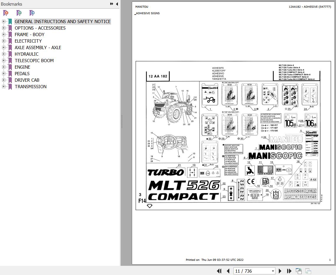 The Bookmarks Of Manitou MLT 526 TURBO SA Telescopic Handler Parts Catalog: