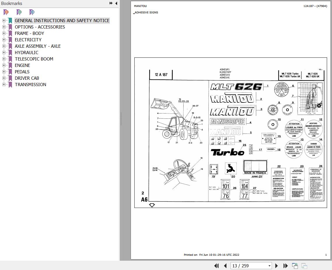 The Bookmarks Of Manitou MLT 626 TURBO Telescopic Handler Parts Catalog: