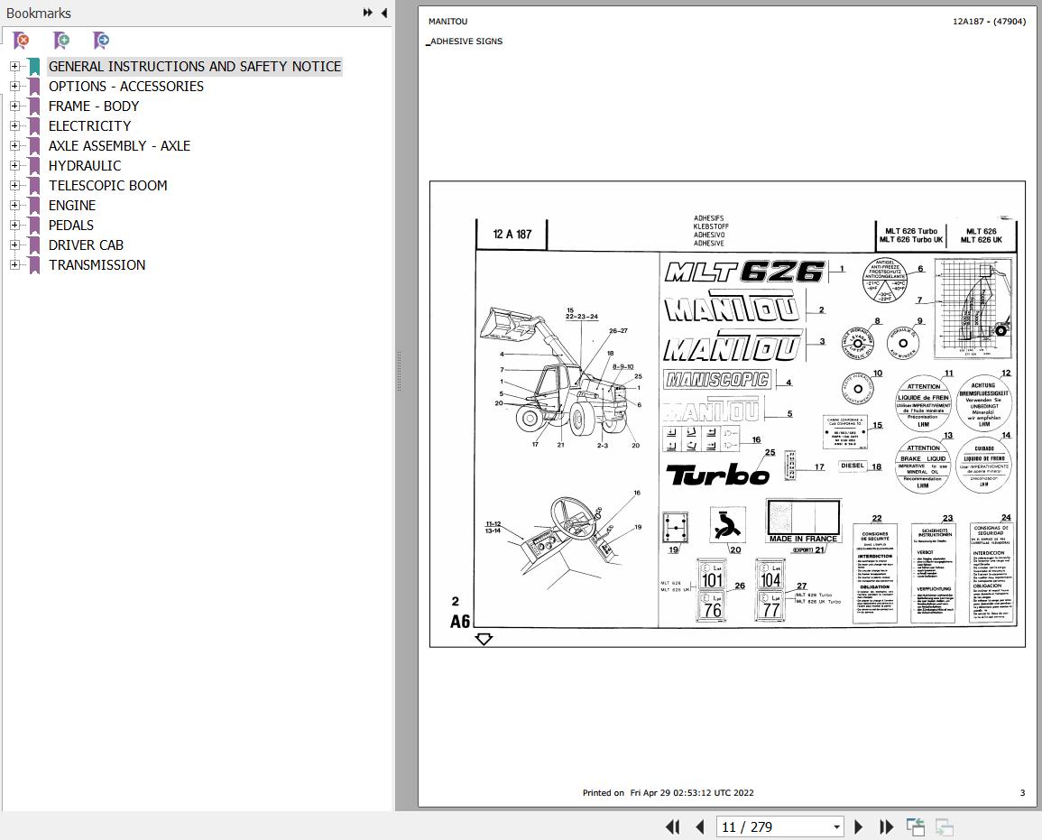 The Bookmarks Of Manitou MLT 626 UK Telescopic Handler Parts Catalog: