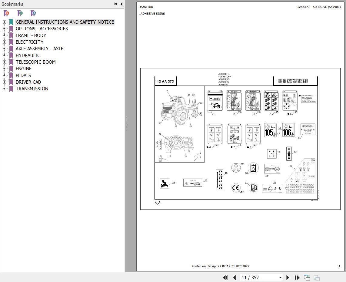 The Bookmarks Of Manitou MLT 627 COMPACT SB E2 USA Parts Catalog:
