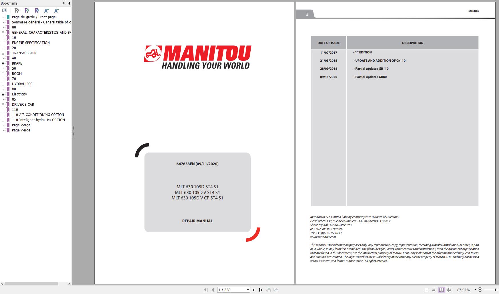 Manitou MLT 630 105D V CP ST4 S1 Telehandler Repair Manual 647633EN 2020